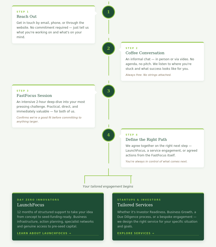 Reach out for an initial conversation. We'll start with a coffee, understand your situation, and take it from there — no pressure, no obligation.